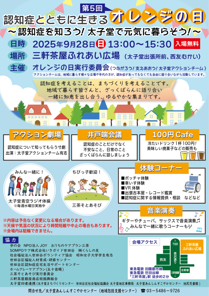 今年で5回目となる『オレンジの日』は、地域に暮らす様々な立場や年代の方が、認知症について知ることができるイベントです。昨年までは平日に開催されていましたが、より多くの方に知っていただきたい!と今年は日曜日に開催することになりました。