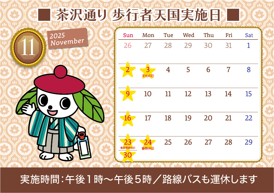 茶沢通りの歩行者天国の実施日は「日曜日と祝日」実施時間は「午後1時から午後5時まで」です。11月3日(月)「文化の日」・11月24日(月)「振替休日」も 歩行者天国を実施します。