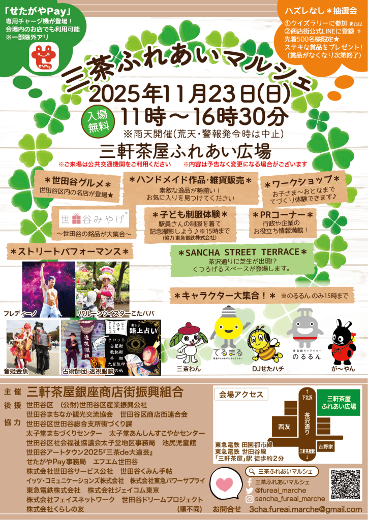 三茶ふれあいマルシェの基礎となるハンドメイド作品の販売はもちろん、実演と作品展示・オーダー受注を展開する作家様が出展します。てづくり体験ができるワークショップも、新しいジャンルのハンドメイドが体験できます。昨年から取り入れた大道芸、今年も素晴らしいパフォーマンスショーを実施します。さらに、大学のジャグリング部によるミニショーとジャグリング体験会も行います。美味しいものがが大集結するグルメコーナーにも、初出展のキッチンカーなどがやってきます。地域に密着した情報を発信している企業や団体によるPRコーナーも充実。そして商店街公式キャラクター「三茶わん」をはじめ、世田谷で人気のキャラクターが5体も登場!みんなで「三茶わんわんわんだほー」を踊っちゃいます♪