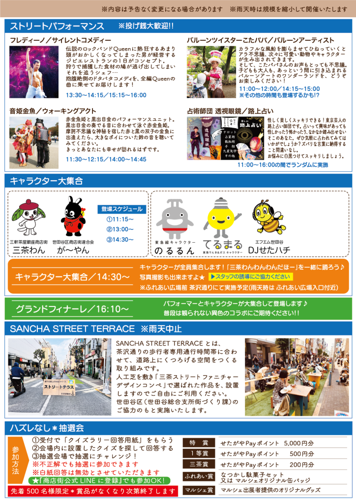 茶沢通りでは、ストリートファニチャーを設置してくつろぎの空間を提供する SANCHA STREET TERRACE も実施します。ふれあい広場会場内では、クイズラリーで参加できるガラポン抽選会も。ハズレなし先着順ですので、ぜひこちらもお楽しみに。
