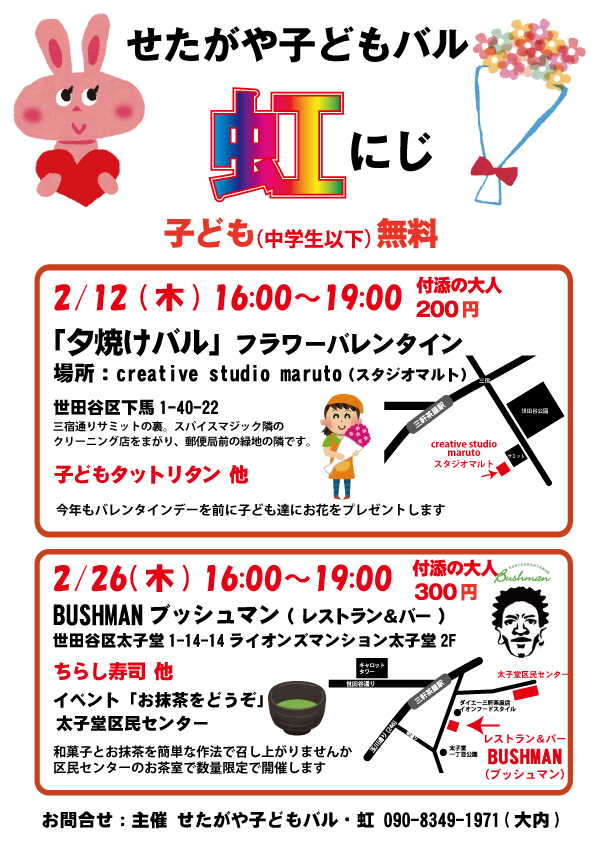 12日(木)のバレンタインイベントは虹バル恒例のお花の配布です。子ども達に「大切な人に渡してね♬」とお花をプレゼントします。26日(木)は新企画の「お抹茶をどうぞ」がスタート!日本文化を優しく身近に知ってもらう企画です。