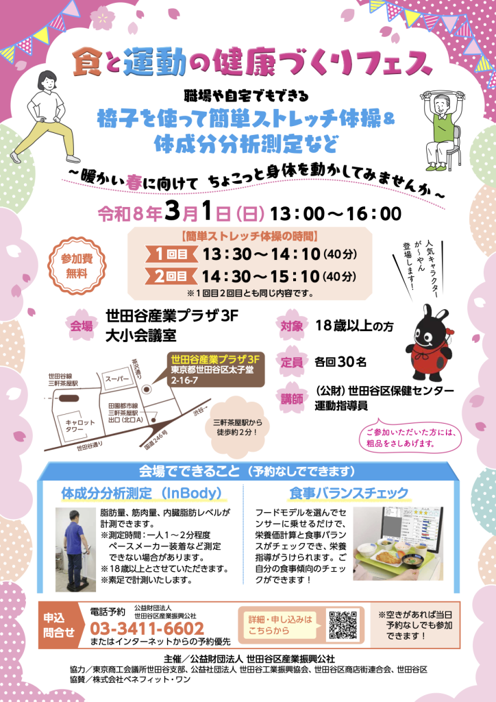会場は世田谷産業プラザ(茶沢通り沿い・ココカラファインのあるビル)3階会議室で、簡単ストレッチ教室(予約歓迎)や体成分分析測定(予約不要)など、健康づくりのためのイベントとなっています。お子さま向けの缶バッジづくりなどのコーナーもあります♪