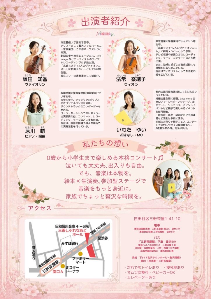 本格的なクラシックの名曲からキッズメドレーまで、ヴァイオリン・ヴィオラ・ピアノのプロの演奏家による生演奏をお楽しみいただけます。