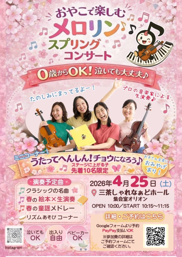 親子で楽しめる参加型音楽イベント🎵「おやこで楽しむメロリンスプリングコンサート」が開催されます。