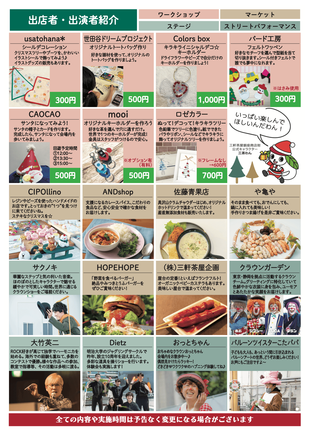 メッセージを書いてツリーに飾ったり、素敵なもの、美味しいものが買えたりします。毎回大好評の手作り体験ができるワークショップもあります。ステージではハーモニカライブや大道芸パフォーマンスなどがお楽しみいただけます。 今年はジャグリングのミニショーや体験会も行います。三茶わんサンタと一緒にダンスを踊ったり、お菓子のプレゼントがもらえる子ども抽選会もあります☆他にも、楽しい内容が盛りだくさんなイベントです。親子で、ご家族でお楽しみくださいね。詳しい内容については、新着情報で随時お知らせいたします。